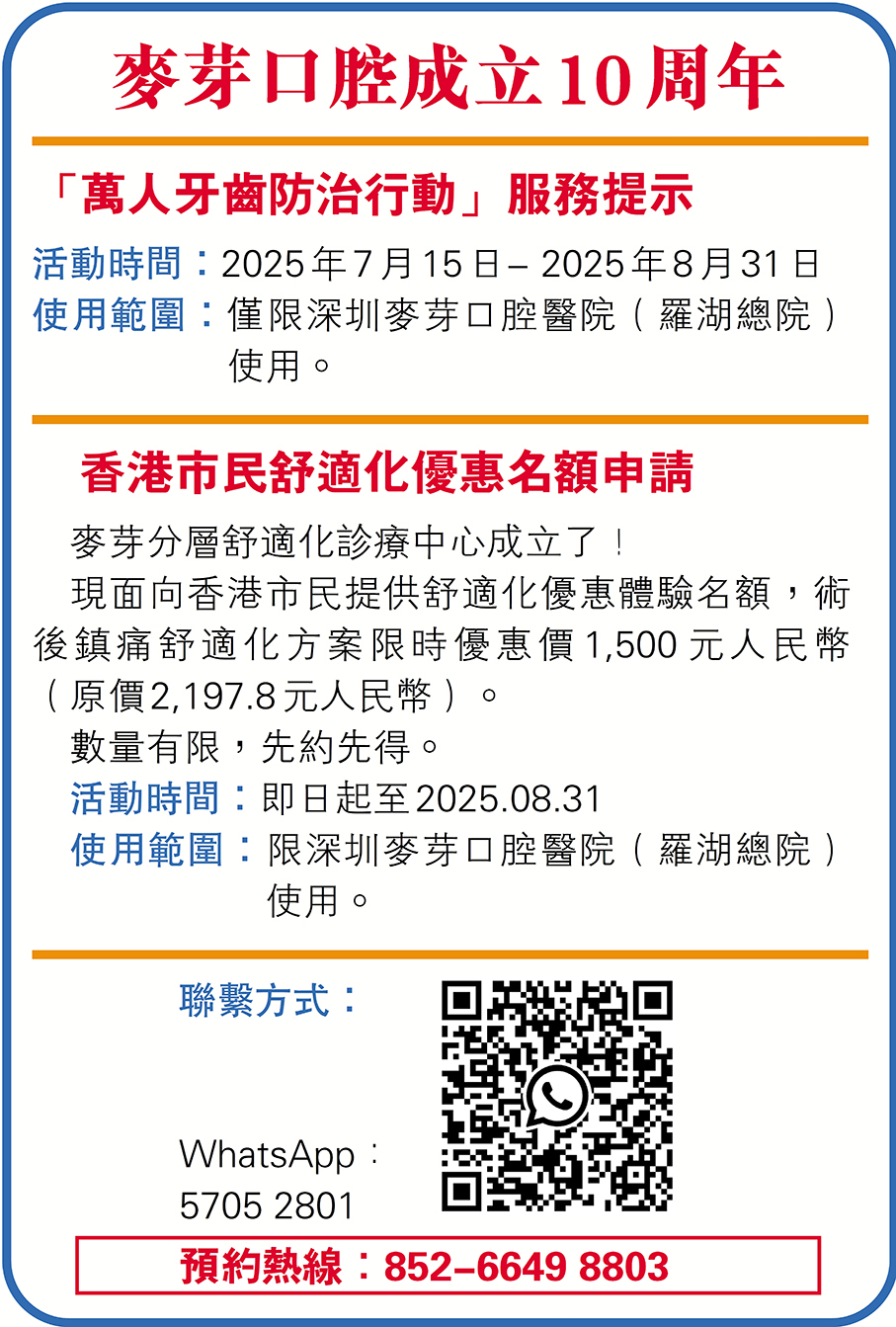 「這些數字背後,是無數個無法正常咀嚼的日夜。」田忠奇表示,當前中老年群體的口腔疾病高發,但接受專業服務比例偏低,防治觀念亟需轉變。因此,「萬人牙齒防治行動」即日起面向深港市民開放預約。深圳市民可撥打0755-82228777,香港市民可致電00852-66498803諮詢參與。