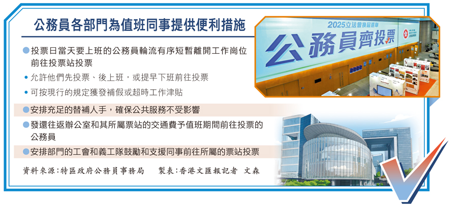 為便利下月7日立法會選舉日當值的公務員履行公民權利,投下神聖一票,特區政府公務員事務局責成各部門為值班的公務員提供一切可行措施,包括實施輪流有序短暫離開工作崗位前往票站投票、安排充足替補人手確保公共服務不受影響等,各部門的公務員積極回應,其中特區政府漁護署高級農林督察曾俊霖日前在接受香港文匯報獨家專訪時表示,該署轄下批發市場及郊野公園等設施終年無休有人員當值,選舉日會准許同事暫離崗位到投票站投票;如路途遙遠,主管可按實際情況允許他們乘坐的士,並可報銷相關開支。特區政府各司局長昨日繼續呼籲公務員及各界人士「動起來」,約定大家12月7日踴躍投票,共建美好明天。(見另稿) ●香港文匯報記者 李芷珊