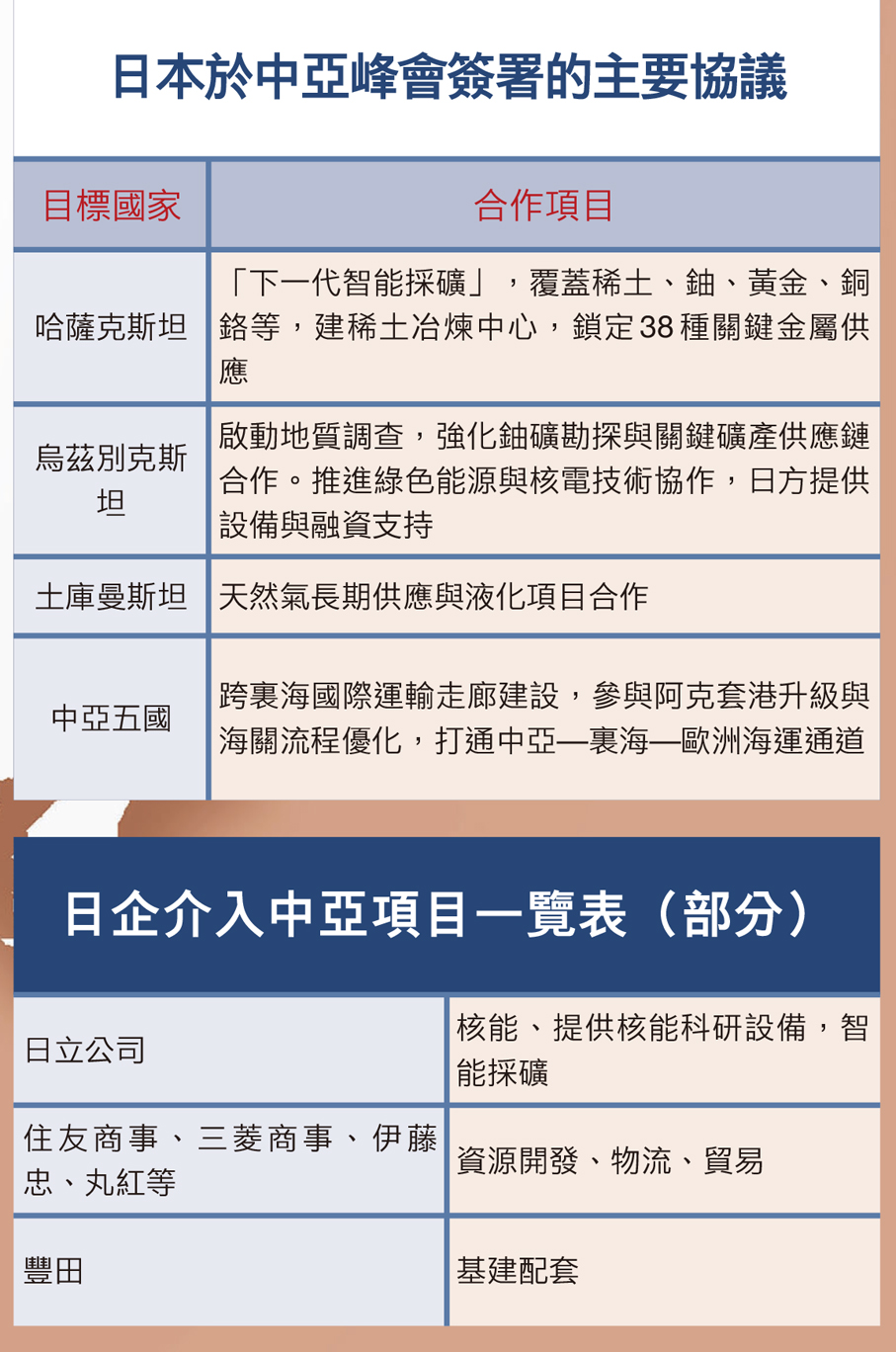 笪志剛指出,在經濟方面,日本正在積極為可能出現的與中國相互「卡脖子」的情況做準備。他舉例稱,剛剛結束的首屆「中亞+日本」首腦峰會上,日本與中亞五國簽署了多達34份協議,並發表了《東京宣言》。日方承諾未來五年在中亞推進3萬億日圓商業項目(見右上表),主要聚焦資源合作、能源合作和互聯互通建設。其中與哈薩克斯坦主推「下一代智能採礦」,覆蓋稀土、鈾、黃金、銅、鉻等38種關鍵金屬供應,建稀土冶煉中心,並積極展開在黃金勘探、精煉與貿易鏈合作,以及核能醫學與核電合作。此外,日本重點支持「跨裏海國際運輸走廊」建設,並參與阿克套港升級與海關流程優化,打通中亞—裏海—歐洲海運通道。上述合作,日方由經濟產業省、外務省牽頭,JICA(日本國際協力機構 隸屬外務省)、日本出口信貸機構提供資金與技術援助。中亞五國則由各國能源部、工業貿易部、礦業公司進行對接(見右下表)。