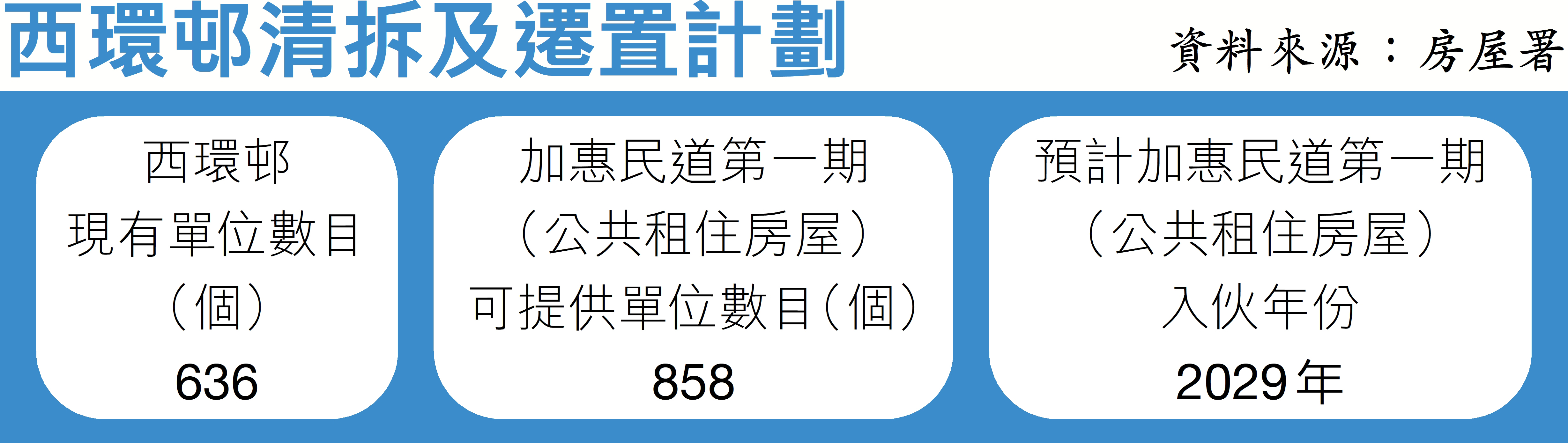 文件指出,選取西環邨作重建研究的主要考慮因素包括樓齡、區內有合適的遷置資源(即附近的加惠民道公營房屋發展項目加惠民道第一期),以及重建可增加單位數目等。自2021年底,房委會宣布展開西環邨重建研究後,房屋署已與相關政府部門就社會福利設施等的重置安排進行磋商,同時亦透過舉辦社區參與活動收集住戶、立法會議員、區議員、學校和相關地區團體等持份者意見。中西區區議會將於下月15日召開會議,討論西環邨的清拆及遷置建議方案。