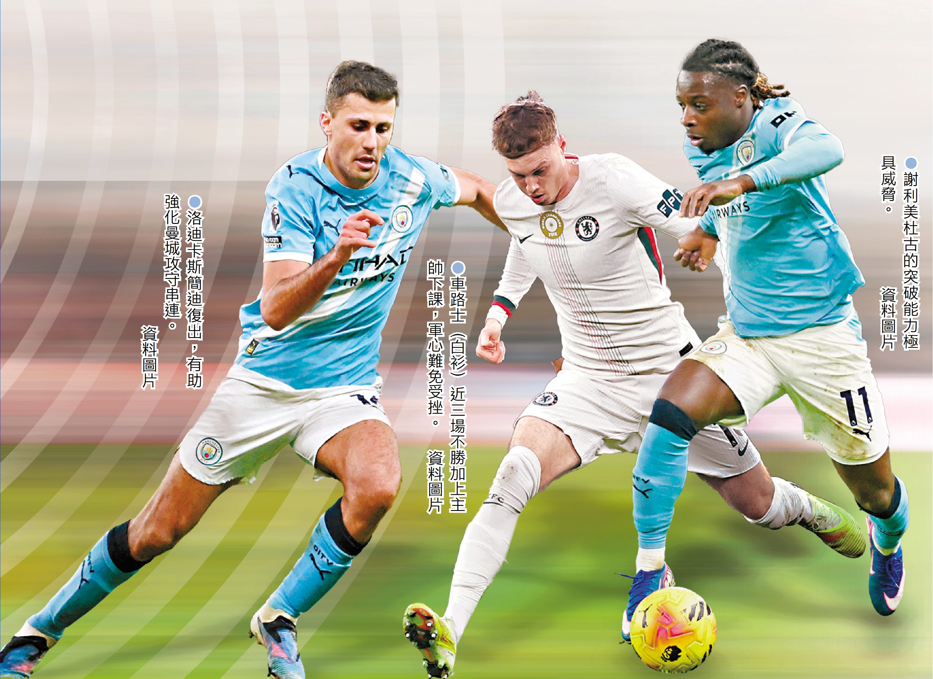 論往績,曼城對上車路士可謂全面佔優,近11次對壘保持不敗,在主場伊蒂哈德近六戰更取得5勝1和的佳績,不過曼城上場與升班馬新特蘭互交白卷而結束八連勝,亦凸顯出入球過於依賴艾寧夏蘭特的問題。幸好今場有望迎來洛迪卡斯簡迪及謝利美杜古兩大主將的復出,前者是中場攻守核心,而後者的速度和突破則是球隊重要的進攻泉源,兩人回歸將成為曼城攻守的一大助力。