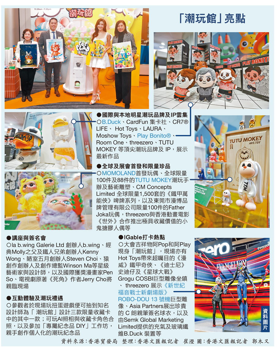 全球潮流玩具市場快速增長,香港正把握先機。第五十二屆香港貿發局香港玩具展、第十七屆香港貿發局香港嬰兒用品展,以及第二十四屆香港國際文具及學習用品展,將於下周一(12日)至下周四(15日)在會展中心舉行。是次三項展覽緊貼全球潮玩及玩具收藏熱潮,以「全新玩意 與眾同樂」為題,吸引來自37個國家及地區、超過2,600家展商,並首次設立「潮玩館」(Pop & Play),匯聚約150個潮玩IP,同步開放予業界買家及公眾,主辦方希望藉此機會打造潮流園,開拓國際市場,發揮潮玩IP的商業潛力,把更多內地和海外品牌「引進來」,亦有參展商接受香港文匯報訪問時表示,看準香港背靠祖國、聯通世界的優勢,希望助力潮玩品牌「走出去」。