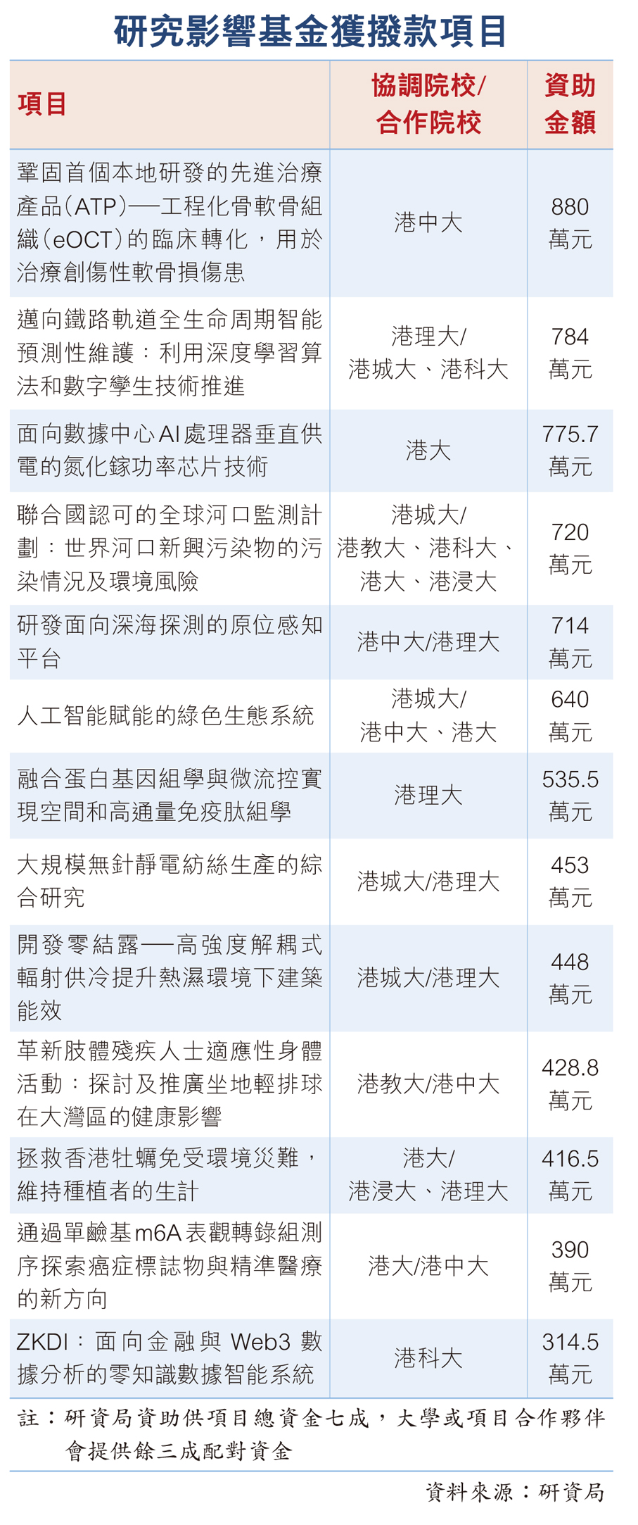 研資局研究影響基金名單揭盅 港校13項入選共獲逾億資助 港中大軟骨再生項目轉移回港生產