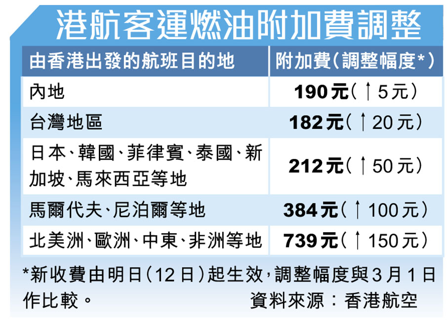 中東局勢不穩,令國際油價飆升,已對香港各方面產生不同影響。香港航空宣布明日(12日)起調整客運燃油附加費,前往中東、歐美等長途航班附加費上調至739元,每程多150元;前往日、韓、泰國等短途航班的燃油附加費加50元,達至212元,增幅達三成。