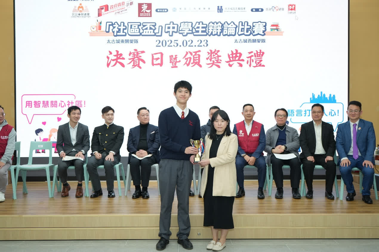 大公文匯網報道,由太古城東、西關愛隊主辦,致遠基金會及香港演辯總會協辦的「社區盃」中學生辯論比賽周日(23日)在小西灣漢華中學進行決賽。在決賽,中國婦女會中學與英皇書院圍繞「關愛隊應否由政府主導」的辯題展開激烈而深入的討論。最終由中國婦女會中學捧盃,最佳辯論員獎項則由英皇書院的周頌謙同學奪得。而同日較早前舉行的季軍賽中,聖保祿中學戰勝聖公會呂明才中學奪得本次比賽第三名。