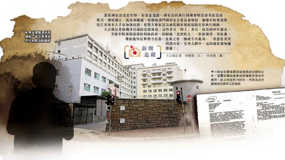 大公報記者接觸多位前政治部成員,這些昔日「特工」表示,政治部95年撤走,不留半點情報資源給特區政府,回歸前「忽然民主」,扶植親美、英政黨,導致境外反華勢力在港一直無王管,釀成今天亂局。「香港是美英間諜天堂,在外人眼中,這的確是個無掩雞籠!」