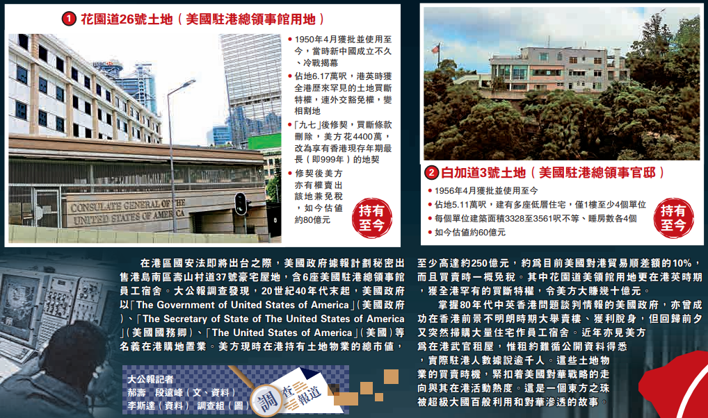 大公報記者 郝壽、段遠峰(文、資料)、李斯達(資料)、 調查組(圖) 報道:在港區國安法即將出台之際,美國政府據報計劃秘密出售港島南區壽山村道37號豪宅屋地,含6座美國駐港總領事館員工宿舍。大公報調查發現,20世紀40年代末起,美國政府以「The Government of United States of America」(美國政府)、「The Secretary of State of The United States of America」(美國國務卿)、「The United States of America」(美國)等名義在港購地置業。美方現時在港持有土地物業的總市值,至少高達約250億元,約為目前美國對港貿易順差額的10%,而且買賣時一概免稅。其中花園道美領館用地更在港英時期,獲全港罕有的買斷特權,令美方大賺幾十億元。