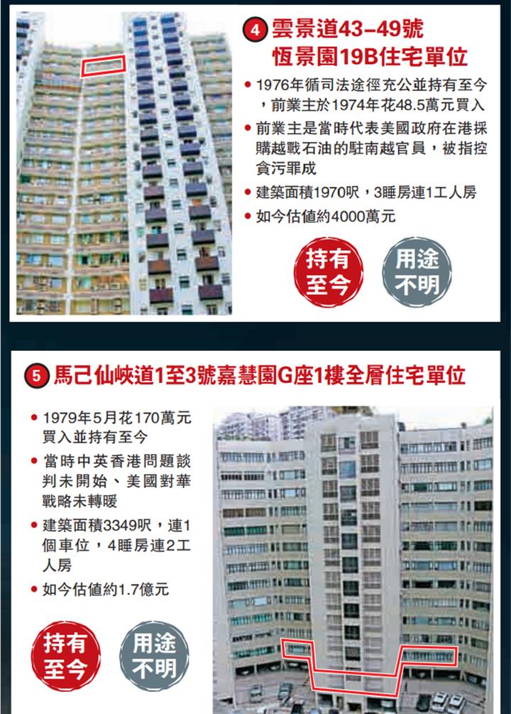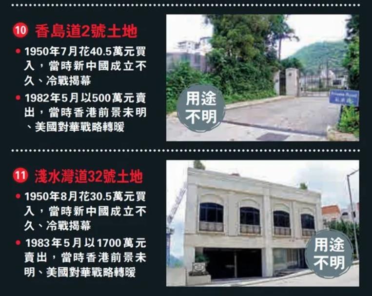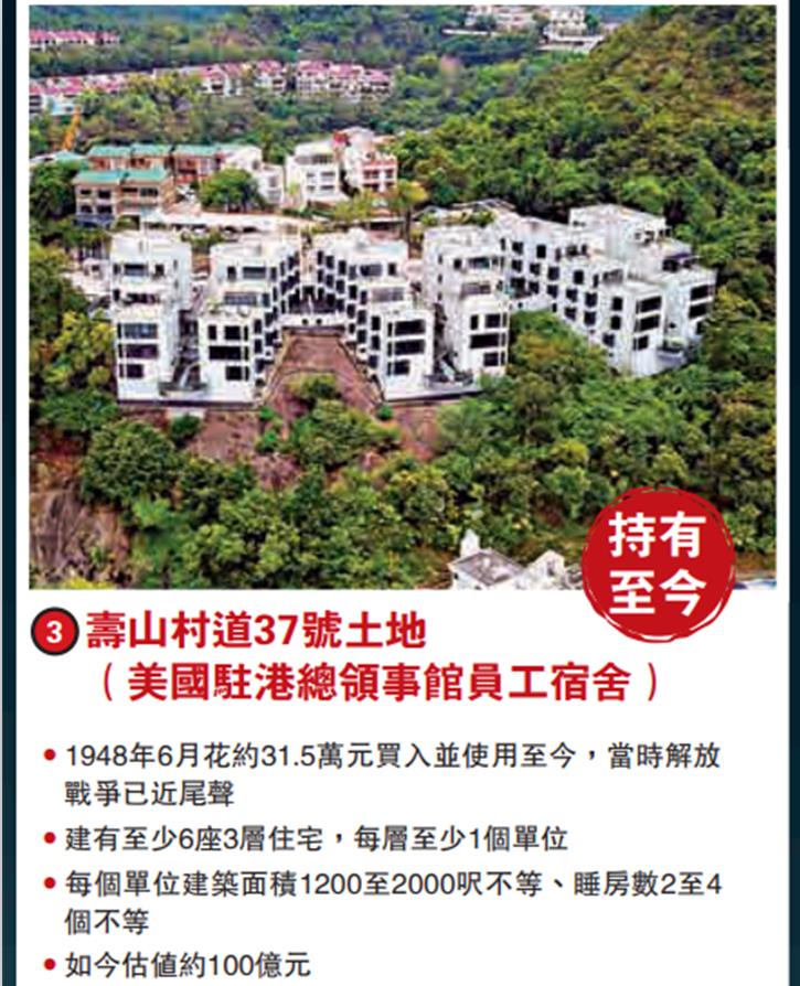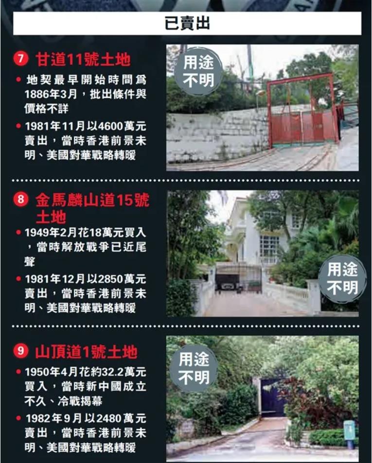 據土地登記資料,直到1979年5月即中英談判尚未開始時,美國政府仍在港置業,花170萬元買入半山馬己仙峽道1至3號嘉慧園G座1樓全層住宅單位,建築面積3349尺,連1個車位,並持有至今,估計升值約100倍。