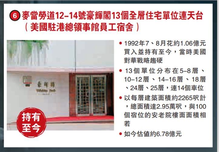 按銀行估價,僅計13個豪輝閣全層住宅單位,今日市值已達約6.78億元,較買入時大賺近7倍。以每層住宅建築面積2265尺計,美領館在此坐擁約2.95萬尺住宅面積,與社會福利署正規劃在新界白石角興建、可供100個宿位的安老院舍總樓面面積相若。