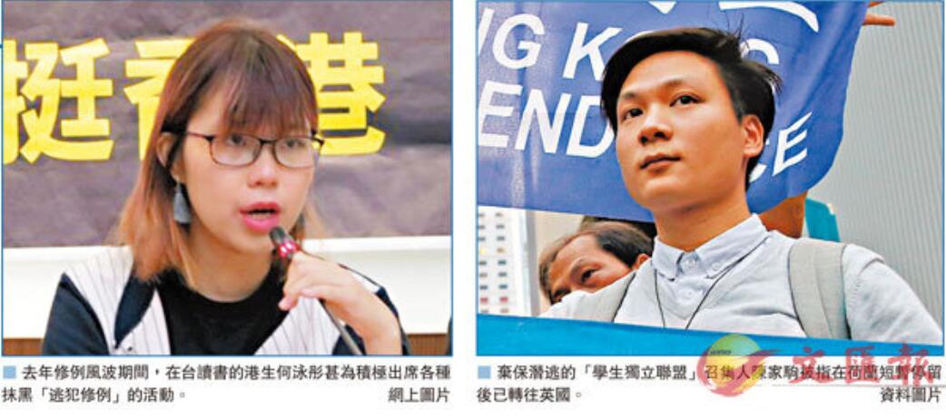 香港文匯報早前獨家報道,「港獨」組織「學獨聯」(又稱「港獨聯」)召集人陳家駒棄保潛逃到荷蘭。近日,有「獨人」再向香港文匯報爆料指,陳家駒在荷蘭短暫停留後已轉往英國。消息並透露,本月4日陳家駒從香港機場離境時,一名叫何泳彤的女子陪同他一起登機潛逃。據了解,何泳彤本身是香港人,目前在台灣文化大學讀書,其言行偏激,去年修例風波期間,她與一些同學在台成立香港在台學生組織,多次參與「港獨」及「台獨」組織和頭目舉辦的反修例活動。陳家駒去年6月中旬竄台期間與何泳彤認識後,迅速拋棄前女友,兩人很快就成為情侶。知情人士稱,何泳彤陪陳家駒離港,是擔心港區國安法實施後,其言行也觸犯法律,因此這對男女是一起「走佬」。■香港文匯報記者 張得民、齊正之