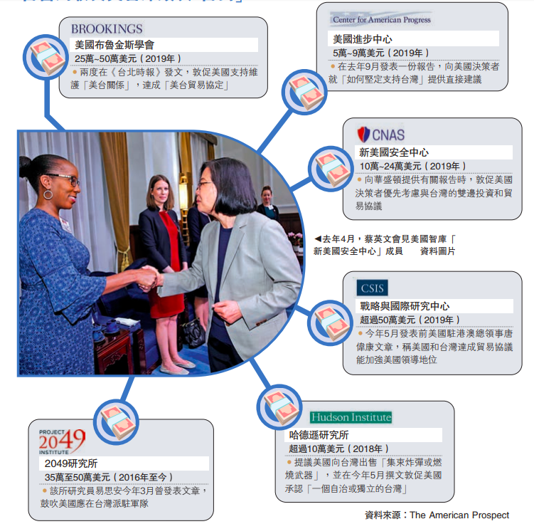 此外,還有一家名叫「2049研究所」的美國智庫,自2016年蔡英文上台後,收取了當局高達35萬至50萬美元的贊助。作為回報,該研究所研究員易思安今年3月曾發表文章,鼓吹美國應在台灣派駐軍隊。