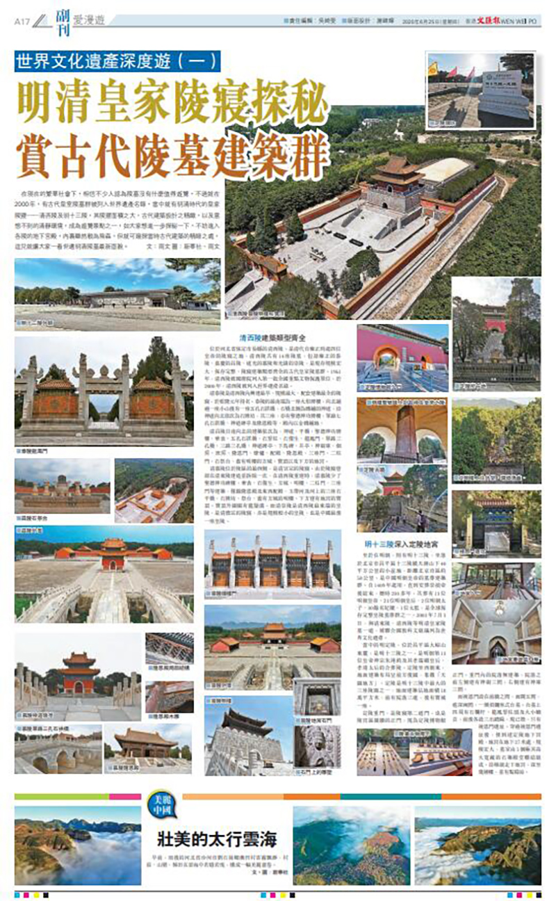 在現在的繁華社會下,相信不少人認為陵墓沒有什麼值得遊覽,不過就在2000年,有古代皇室陵墓群被列入世界遺產名錄,當中就有明清時代的皇家陵寢--清西陵及明十三陵,其陵寢面積之大,古代建築設計之精緻,以及意想不到的清靜環境,成為遊覽景點之一,如大家想進一步探秘一下,不妨進入各陵的地下宮殿,內裏雖然較為陰森,但就可窺探當時古代建築的精細之處,這兒就讓大家一看世遺明清陵墓最新面貌。 ■文︰雨文 圖︰新華社、雨文