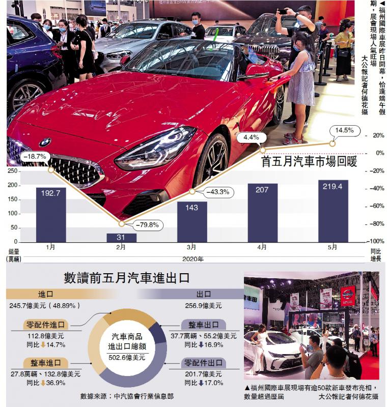 受新冠肺炎疫情影響停擺的會展業陸續按下「重啟鍵」。原於五一期間舉行的福州車展6月25日啟幕,100多個汽車品牌、逾50款新車亮相,新車發布量比以往歷屆多,展商熱情十足,場館人頭湧動,預計銷售車輛1.2萬輛,實現銷售收入約30億元(人民幣,下同),有望引爆端午小長假消費。車展也成為觀察內地汽車消費加速復甦的一扇窗口,主辦方憧憬將發揮首發優勢,起到示範帶頭作用,拉動經濟復甦。