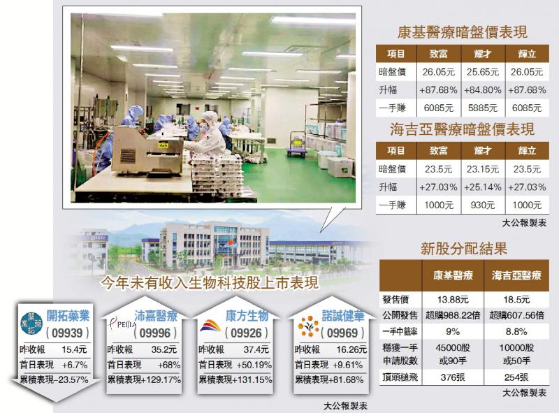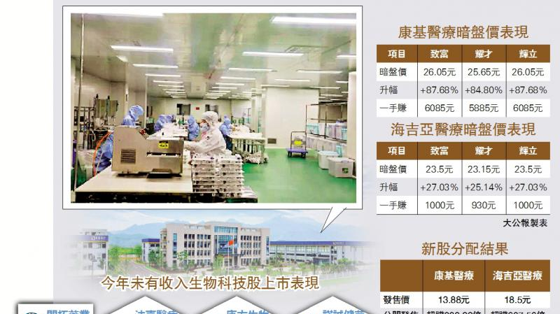 今年生物科技股當炒,大部分上市新股都錄大幅上升。將於下周一(29日)掛牌的康基醫療(09997)以及海吉亞醫療(06078),暗盤表現造好,當中康基醫療更升近九成,不計手續費每手賺6085元,至於海吉亞暗盤亦有逾25%的升幅。分析認為,由於預計相關股份上市時已有很高升幅,不建議投資者高追,尤其是不熟悉生物科技的投資者。