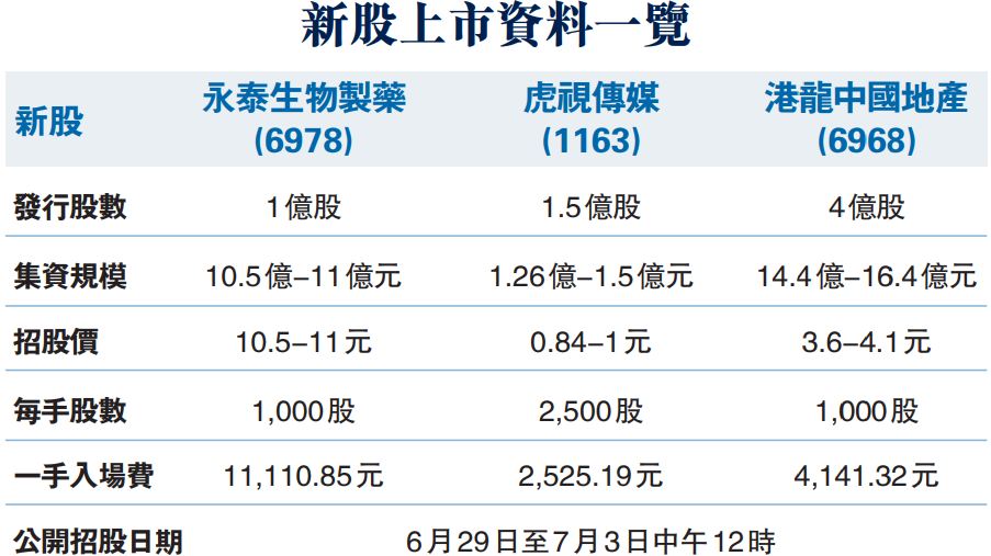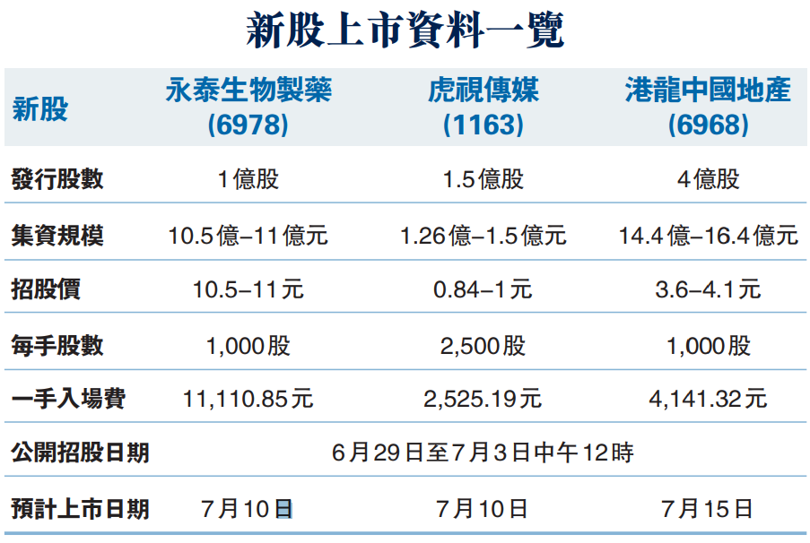 (香港文匯報記者 殷考玲)新股熱潮持續,今天再有兩隻新股招股。尚未有盈利的生物科技公司永泰生物製藥(6978)擬集資約10.5億至11億元,每股招股價10.5至11元,每手1,000股,入場費11,110.85元,下月10日掛牌。另一隻為港龍中國地產(6968),集資額約14.4億至16.4億元,每股招股價3.6至4.1元,每手1,000股,入場費4,141.32元,下月15日掛牌,該股引入兩名基礎投資者,包括恒基地產(0012)主席兼董事總經理李家傑旗下Successful Lotus。