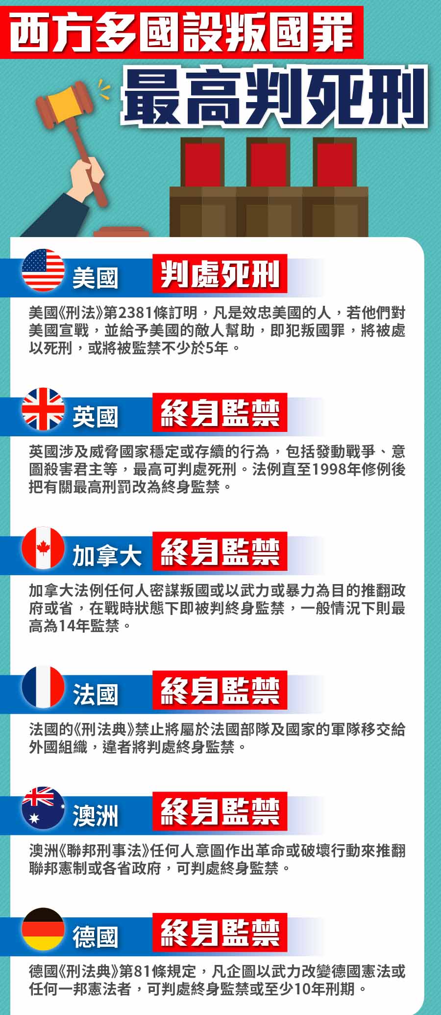 據大公文匯全媒體報道,全國人大常委會29日繼續審議港區國安法。列席會議的港區全國人大代表葉國謙透露,港區國安法將會列明叛國罪處以最高死刑的懲罰。其實,在美國、英國等西方多個國家,都在相關法例中定明嚴懲叛國者,美國最高會判處死刑。英國、法國、德國等國刑罰則一律判處終身監禁。