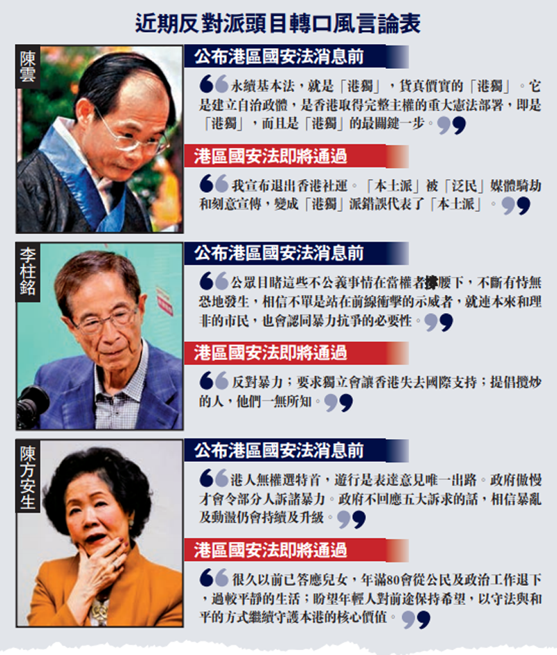 港區國安法即將出台,亂港頭目惶恐不安。繼民主黨創黨主席李柱銘、前政務司司長陳方安生紛紛改口縮沙之後,提出「香港城邦論」的「港獨」狗頭軍師陳雲前日亦在facebook發帖,高調宣布退出香港社運,聲稱自己的理論被「港獨」騎劫。有暴徒即刻鬧爆陳雲,並翻舊賬踢爆陳雲本人在2016年立法會選舉落敗後公開自認「永續基本法,就是『港獨』,貨真價實的『從』」。有市民指出,陳雲之流其實是懼怕港區國安法,現時假扮轉軚,由「明獨」轉為「陰獨」,進行地下活動,提醒執法部門在國安法立法後亦必須留意這些人的真面目,嚴正執法。\大公報記者 海芯葆