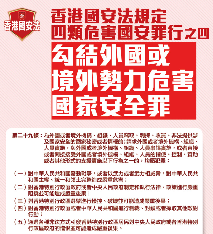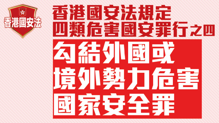 香港國安法規定的四類危害國家安全的罪行中,涉及了勾結外國或境外勢力危害國家安全罪,是指為外部勢力竊取、刺探、收買、非法提供涉及國家安全的國家秘密或者情報的;請求外部勢力實施,與外部勢力串謀實施,或者直接或者間接接受外部勢力指使、控制、資助或者其他形式的支援實施危害國家安全行為。