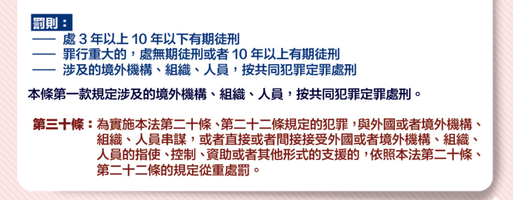 若犯此罪將處3年以上10年以下有期徒刑;罪行重大的,處無期徒刑或者10年以上有期徒刑,有關境外機構、組織、人員,按共同犯罪定罪處刑。