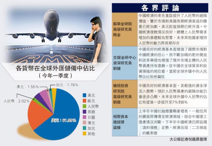 (大公報記者 倪巍晨)國際貨幣基金組織(IMF)最新數據顯示,人民幣在全球外匯儲備中的佔比由去年四季度的1.9%提升至2.02%,創2016年第四季度公布該數據以來新高。受訪專家指出,中國經濟的率先重啟,使人民幣資產的避險價值得到提升,而不斷加碼的改革開放措施也增強了境外市場主體增持人民幣資產的信心,未來全球外匯儲備中人民幣比重有望增至7%到8%。