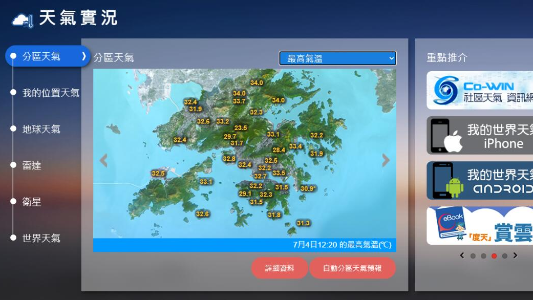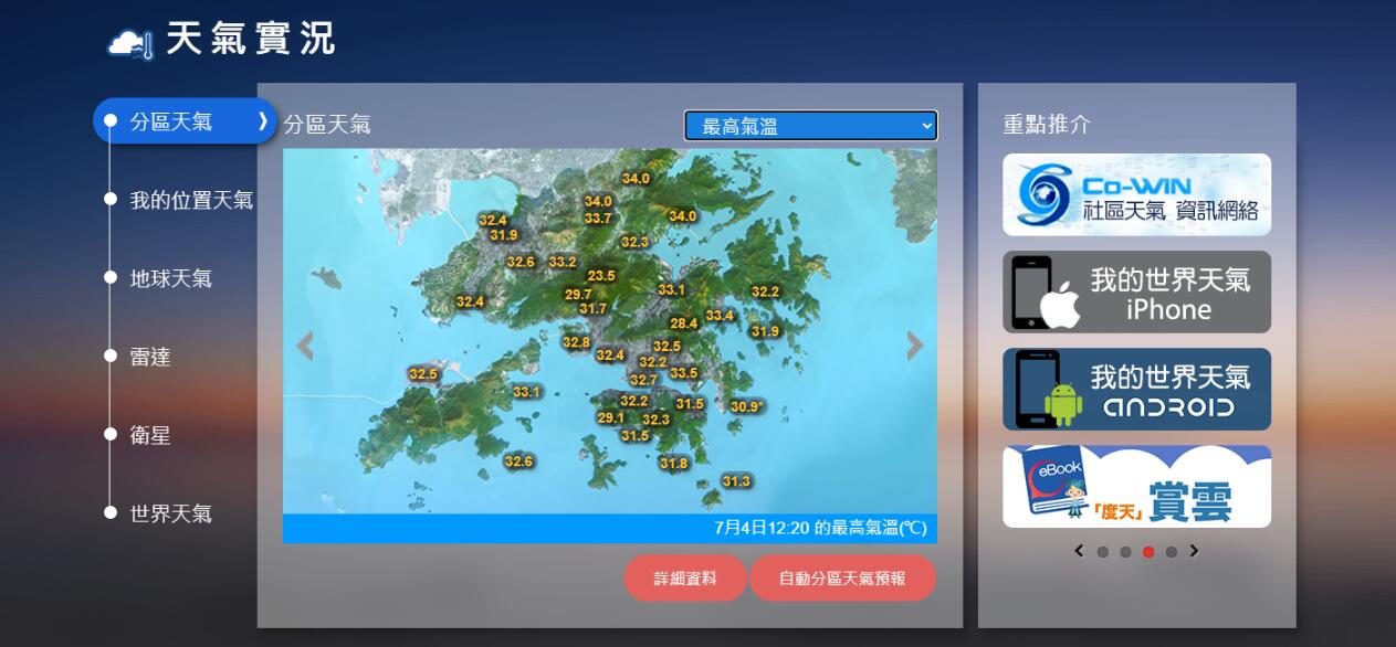 天文台在今日(4日)上午11時10分發出酷熱天氣警告,並料今日本港天氣酷熱,提醒市民慎防中暑。直至上午12時,黃大仙、九龍城、跑馬地、西貢等多區錄得32度以上高溫,而上水、打鼓嶺及大美督等新界北部更錄得34度高溫。