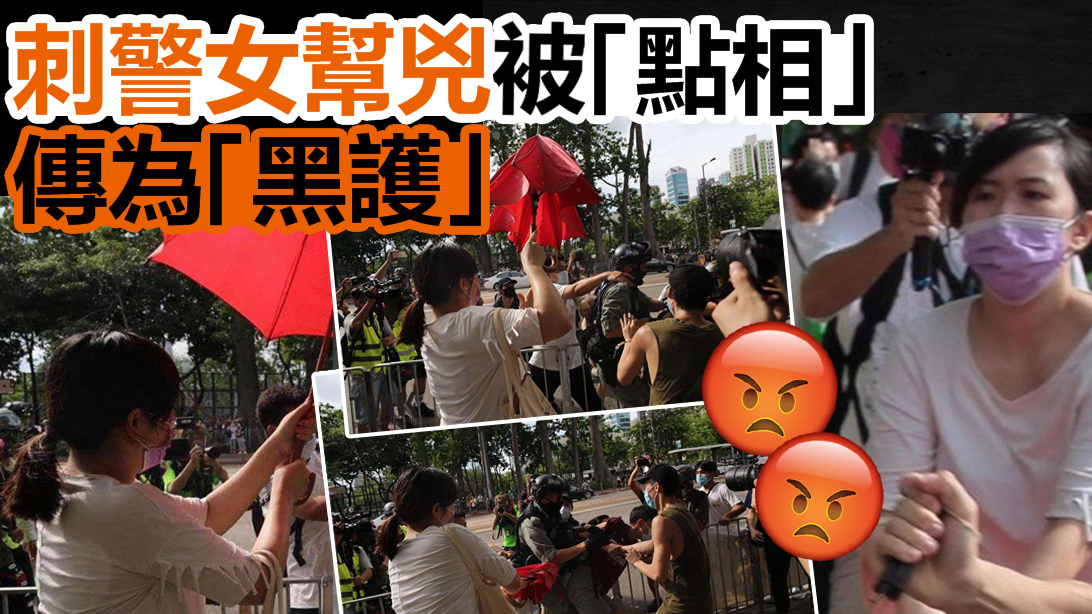七一回歸當日黑暴動刀兼搶犯,遇刺的防暴警員除遭受24歲男子黃鈞華持利器襲擊外,更有白衣暴徒向防暴警箍頸拉扯,另一名白衣女暴徒則不斷用紅色長傘插向警員。昨日網上圖文並茂瘋傳一張戴帽女子的相片,相片右上角標明「全球通緝」,相中間大大隻字寫上「紅雨傘打警察惡婦」,下款「雅麗氏何妙齡那打素醫院Sxxx Lee黑醫護」。雖然未能證實相中人真正身份,但醫管局稱會按照既定程序跟進有關投訴。