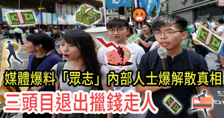爆料人續指,6月29日,「香港眾志」賬戶大部分錢被取走,「6月30日上午,黃周羅三人相繼退出香港眾志,香港眾志內部一下子亂咗陣腳,黃子悅等人隨後開會擬重新選出新嘅領導層,繼續維持香港眾志運作,會間驚聞眾志戶口嘅錢已被黃之鋒、周庭、羅冠聰三人攞走,所剩唔多,引發眾怒。」爆料人表示最終因資金窘迫,「香港眾志」被迫於6月30日解散。