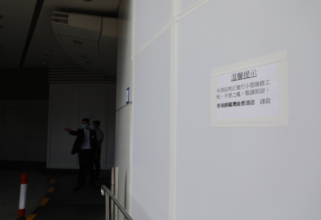 現場所見,銅鑼灣維景酒店外圍已用圍板圍封,有工程車在酒店外運送物料,數名工人在外牆進行維修及加裝牌匾。另有多名警員在酒店外圍巡邏。