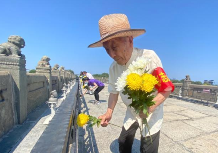 據中新網報道,7月7日,89歲高齡的抗戰歷史義務講解員鄭福來老人來到盧溝橋上,和宛平地區民眾一起祭奠抗戰英烈。北京市豐台區宛平城內以「戰地黃花」為主題,以黃色、橙色孔雀草為主體,烘托全民族抗戰爆發83周年的莊重氣氛,重溫歷史、緬懷先烈、珍愛和平、開創未來。