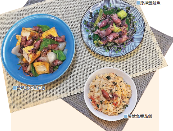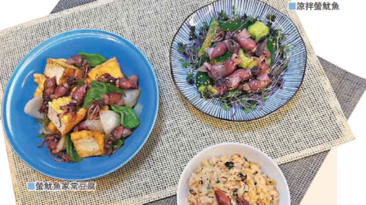 據香港文匯報報道,螢魷魚肉味甜美,營養豐富,是一種美味的養生食品,這種體積細小的「迷你小魷魚」又叫做小卷,由於其身體表面有發光的組織,一旦受到外部刺激,就像螢火蟲那樣發出藍白色的光,所以又叫做螢光魷魚。吃螢魷魚有益於人體的健康和保健,它富含鐵、鈣、磷元素,不但可以提供造血的原料,改善貧血,還能促進骨骼的生長發育健康。今期,以這螢魷魚為主烹調三款養生菜,包羅涼拌、主菜及米飯。