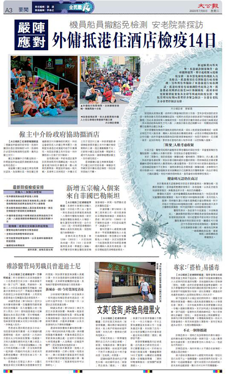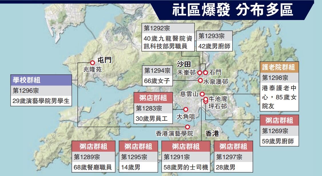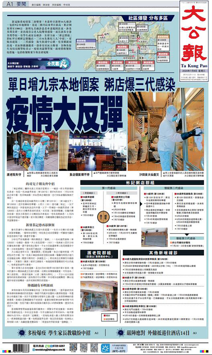 【7·8香港連線】大公報記者 謝進亨、謝瑩瑩、曾敏捷、方學明 報道:新冠肺炎疫情第三波爆發!本港昨日新增14人確診,包括9宗本地個案,是近三個月以來單日新高,累計個案增至1300宗。新增九名確診患者牽連範圍甚廣,涉及多間食肆,並出現首宗老人院爆發感染,而且波及全港多間學校,有學生或家長確診。食肆方面,「彬記群組」彩虹坪石邨彬記粥麵店,三日內先後有六人「中招」,更疑出現第二、三代感染。衞生防護中心稱,有多個源頭出現,社區傳播鏈嚴重,恐會有社區大爆發。食物及衞生局局長陳肇始表示,疫情再敲響警號,政府將收謹防疫措施,包括收緊限聚令與食肆規限。
