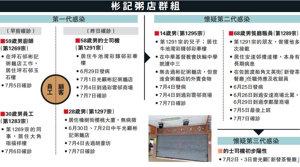 另一名確診食客是58歲男的士司機(第1291宗),與14歲兒子(第1295宗)居於彩輝邨彩華樓,上周三(3日)曾光顧「彬記」,兒子無到過該店,但曾進食該店的外賣,父子一同確診。68歲男患者(第1289宗)是的士司機男患者的朋友,在佐敦「新發苶餐廳」任職侍應及收銀,曾多次乘搭的士司機朋友的車進出,他有長期病患,上月25日曾因呼吸道不適求醫,前日情況轉差,到觀塘聯合醫院急症室求診,並證實感染。