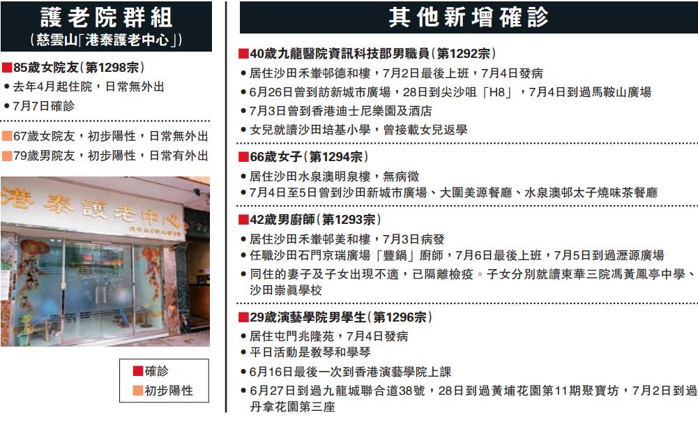 本港出現首宗護老院確診個案,患者是慈雲山港泰護老院的一名85歲女院友(第1298宗)。據消息指,港泰昨初步確診的一男一女院友,昨晚上覆檢證實確診,該院亦有兩名職員初步確診;另有兩人來自其他護老院的員工亦初步確診。