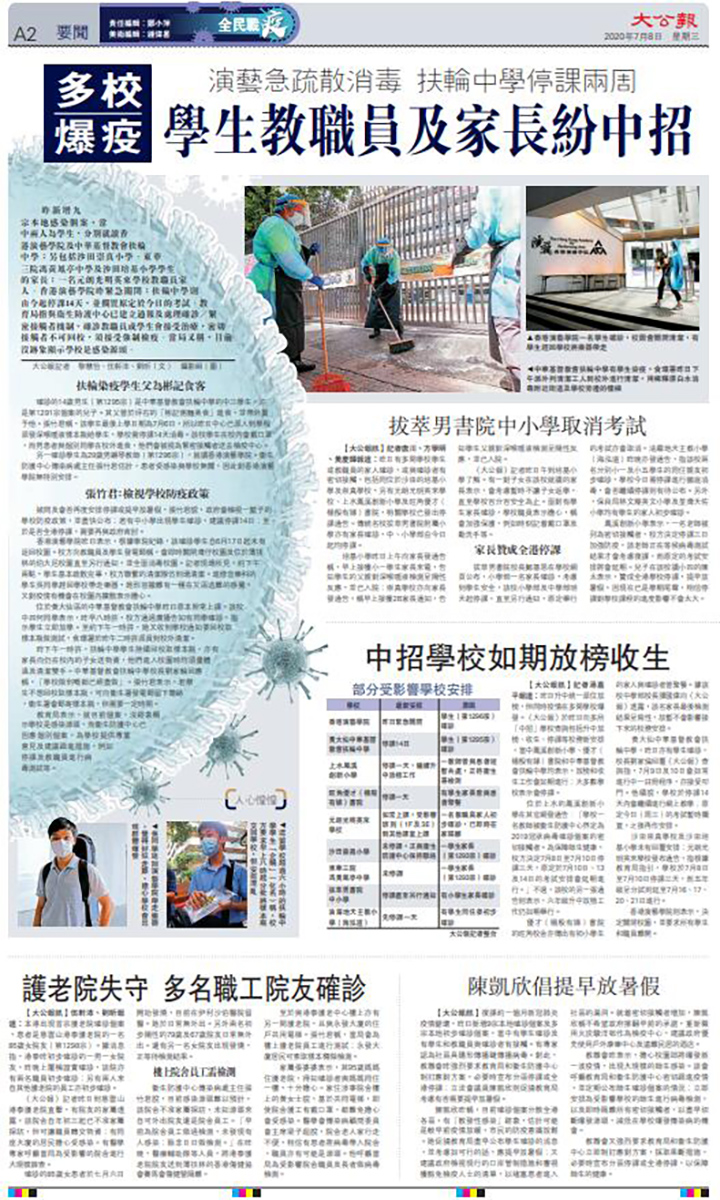 昨新增九宗本地感染個案,當中兩人為學生,分別就讀香港演藝學院及中華基督教會扶輪中學;另包括沙田崇真小學、東華三院馮黃鳳亭中學及沙田培基小學學生的家長;一名元朗光明英來學校教職員家人。香港演藝學院昨緊急關閉;扶輪中學則由今起停課14天,並擱置原定於今日的考試。教育局指與衞生防護中心已建立通報及處理確診/緊密接觸者機制,確診教職員或學生會接受治療,密切接觸者不可回校,須接受強制檢疫。當局又稱,目前沒跡象顯示學校是感染源頭。
