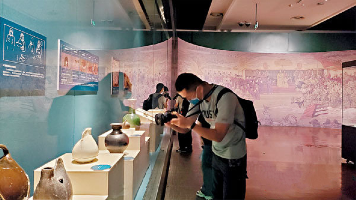 展覽分為三大部分,第一部分「草原帝國」,通過雞冠壺、馬具、捺缽用具等,展示契丹民族轉徙隨時、朔漠穹廬以及馬背民族的遊牧文化特色;第二部分「幽幽文明」,通過服飾類文物、文房用具、佛教文物以及著名遼墓出土文物等,展示遼在服飾配飾、文化娛樂、佛教信仰和厚葬習俗等方面的內涵;第三部分「多元兼容」,通過陶瓷茶具、金銀器、玻璃器等,展示宋遼交往,尤其是澶淵之盟後文化互通的歷史,以及遼在草原絲路上留下的深刻印跡。