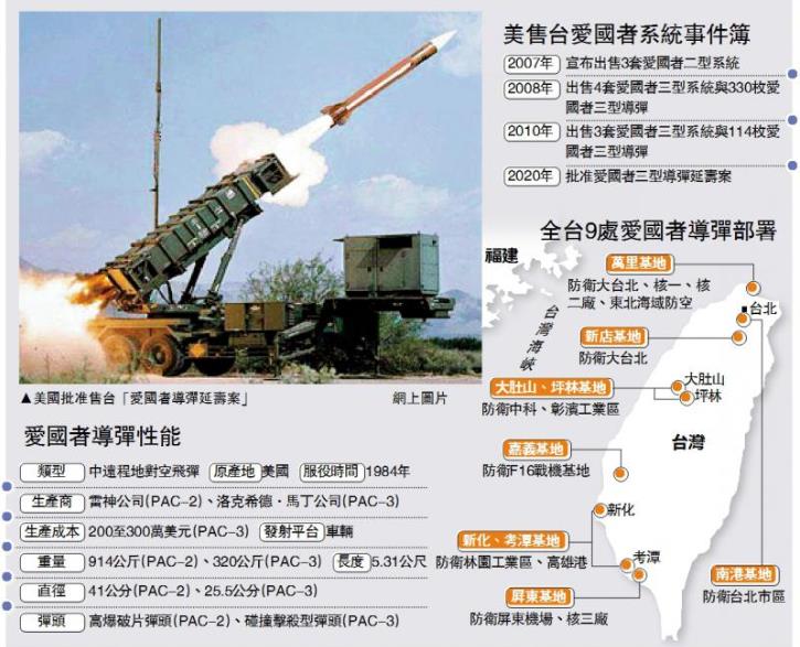 「愛國者三型導彈」是台灣高空層防禦的重要武器,部署在台灣主要城市、重要軍事設施周邊。自2017年起,特朗普政府年年對台軍售,從早期一年一次,到去年一年三次,2020年至今已經兩度軍售。