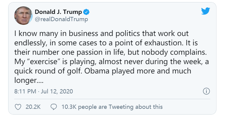 特朗普表示,他認識許多商界和政界人士,他們都有在不停鍛煉,並稱沒有人對此抱怨。他強調,自己的鍛煉只是打高爾夫,且很快就能打完一輪,同時從來不在工作日打。但奧巴馬打高爾夫球打得更多、更久,都沒問題。