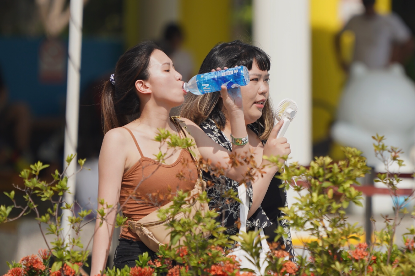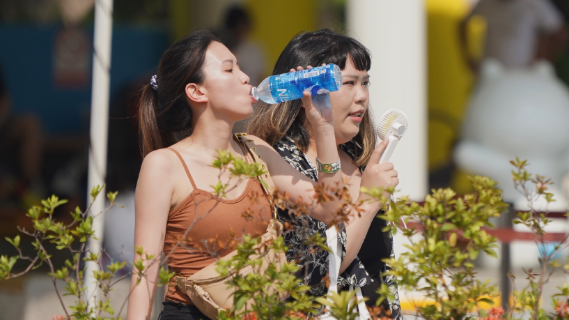 台北今日(13日)飆高溫,氣象局測站中午11時59分氣溫達攝氏38.9度,創下歷年7月最高溫紀錄,台北民眾在戶外喝飲料補充水分,也有人以隨身電扇消暑。