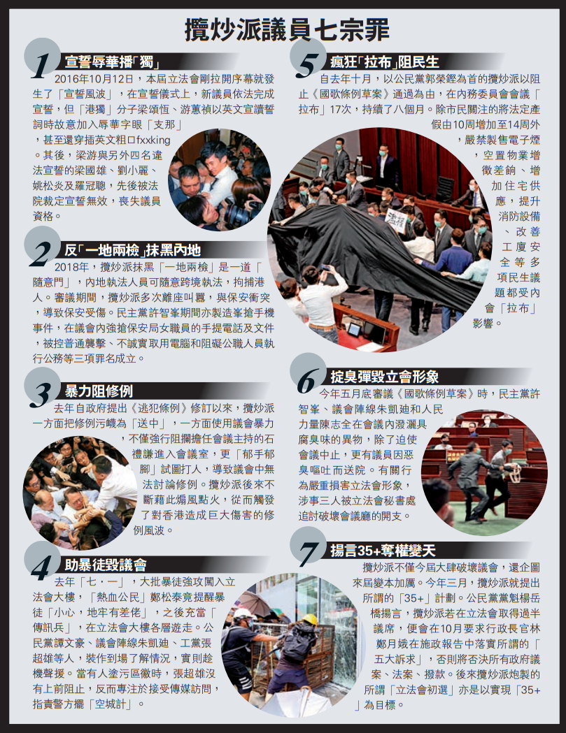 攬炒派不僅今屆大肆破壞議會,還企圖來屆變本加厲。今年三月,攬炒派就提出所謂的「35+」計劃。公民黨黨魁楊岳橋揚言,攬炒派若在立法會取得過半議席,便會在10月要求行政長官林鄭月娥在施政報告中落實所謂的「五大訴求」,否則將否決所有政府議案、法案、撥款。後來攬炒派炮製的所謂「立法會初選」亦是以實現「35+」為目標。