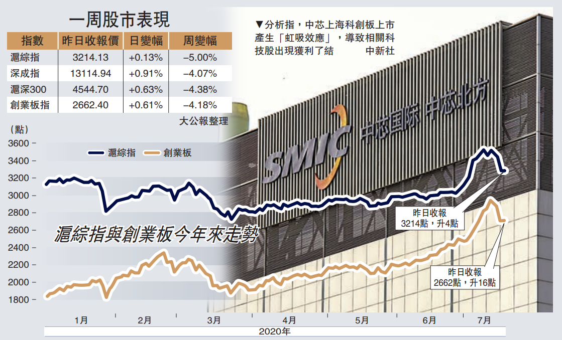 對比此前,A股7月初走勢如虹,滬綜指接連闖過多個整數關口,直達3400點,市場狂呼「牛市已至」。據wind數據顯示,7月份,滬綜指從3000點到3400點,僅用了6個交易日。但在本周,三大指數快速回調,均跌逾4%(見附表)。滬綜指周一大漲1.77%,一度直衝3500點,但周二開始回落,3天內重回3200點,全周指數跌5%,連漲四周斷纜;滬深300指數本周跌4.4%,為3月以來最大跌幅。渤海證券指出,近期通過滬港通外流的資金數量龐大迅速打擊人氣,在此同時中芯國際上海科創板上市產生「虹吸效應」,導致相關科技股出現獲利了結。