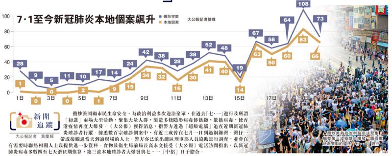 攬炒派為政治利益違法聚集,觸發第三波疫情大爆發。大公報記者綜合衞生防護中心由七月一日至20日的確診宗數及本地感染數字,發現七月一日28宗確診個案,只有一宗是本地感染,但經過攬炒派七一違法集結後,七月八日的本地感染個案突然大幅上升至八成。