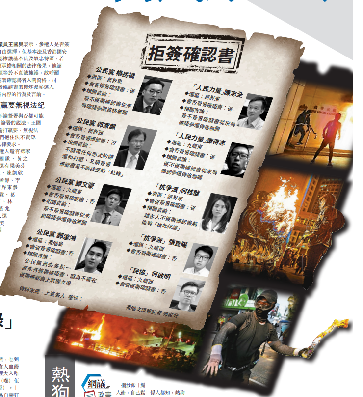 然而,多名攬炒分子昨日卻公然聲稱不論簽署與否都可能會被DQ,又指簽不簽署確認書從來與確認參選資格無關,更甚者認為不簽確認書能「彼此保護」,因此揚言將拒絕簽署確認書(見另表)。