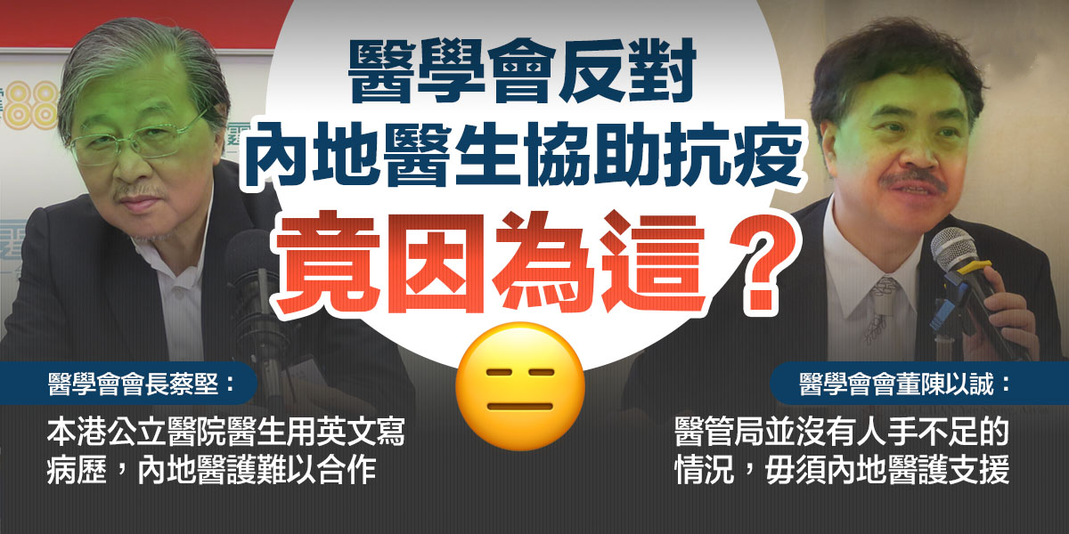 中央支持香港抗疫本是好事兒,但醫學會會長蔡堅卻表示,公立醫院醫生用英文寫病歷、藥物,用電腦輸入資料,而內地醫護講普通話、寫簡體字,相信會製造一定混亂,難以合作。更可笑的是,面對記者提問「澳門和新加坡的核酸檢測都可以做到一天一兩萬個,為何香港做不到」,蔡堅卻回答稱「特首唔同」。