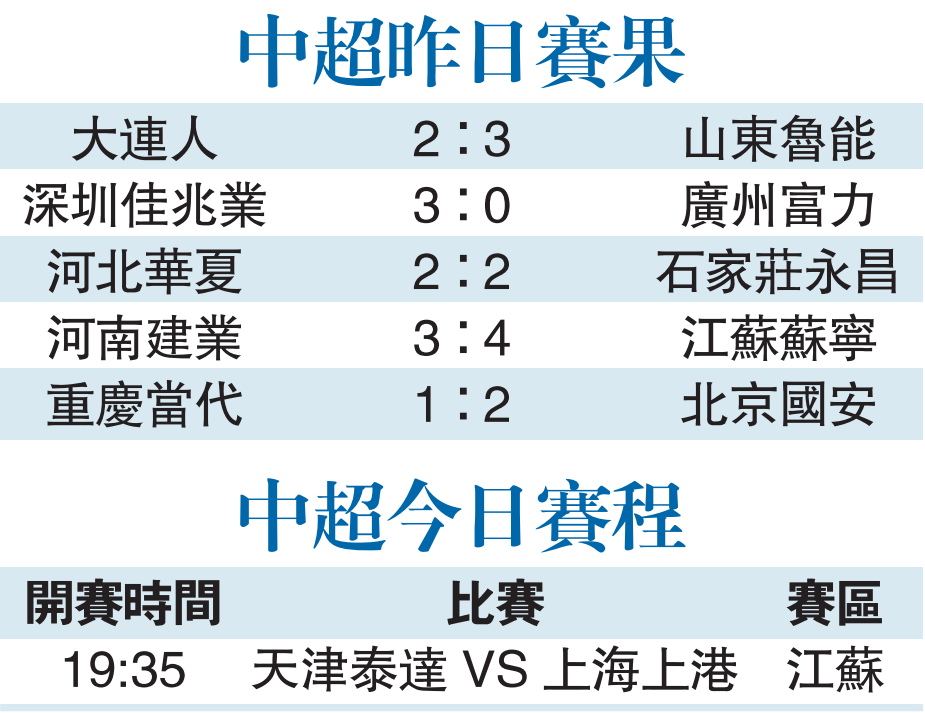 (香港文匯報記者 陳曉莉)中國足協超級聯賽(中超)剛於周六揭幕,首輪最後一場比賽今晚在江蘇昆山體育中心舉行,由上海上港對陣天津泰達。而昨日在大連賽區結束的「廣東打吡」戰中,港足中場陳俊樂為廣州富力正選上陣,面對同樣有前港青代表戴偉浚正選的深圳佳兆業,最終佳兆業有戴偉浚上半場交出助攻下,以3:0大勝富力。