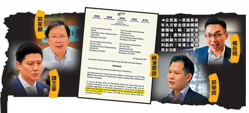 選舉主任發信給公民黨參選人時,附上了一封楊岳橋、郭家麒、郭榮鏗、陳淑莊、譚文豪於2019年9月以立法會議員名義,寫給美國國會領袖的信件。信中提到,公民黨「誠摯地懇求閣下及閣下的同僚們」,盡快通過「香港人權與民主法案」。公民黨議員亦在信中親筆簽名。而該法案的目的正是讓美國制裁香港、損害香港利益,並以此打擊中國發展。