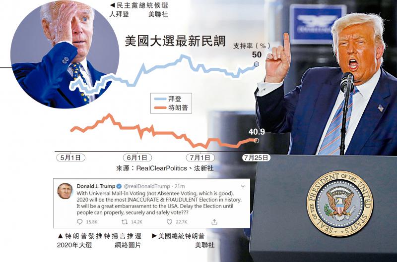 大公報綜合《紐約時報》、《華盛頓郵報》報道:美國總統特朗普因為抗疫失敗、處理種族示威不當,而選情低迷,他7月30日在推特上指責全民郵寄投票將使2020年大選成為史上最不準確、充滿欺騙的大選,並首次揚言要推遲大選,令外界震驚。民主黨候選人拜登早在4月就曾警告過,特朗普會試圖以某種方式推遲選舉來延長任期,而特朗普當時回應稱選舉絕不會推遲。