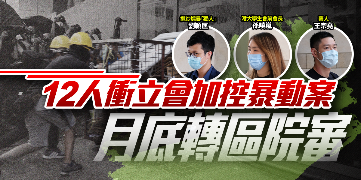 據大公文匯全媒體報道,攬炒煽暴「獨人」劉頴匡、港大學生會前會長孫曉嵐及藝人王宗堯等12人,去年7月1日在立法會外示威及衝擊立法會,分5案被起訴進入或逗留在會議廳範圍罪,12人後被加控一項暴動罪,案件今日(3日)在西九龍裁判法院提訊。裁判官將案件押後至8月20日,以轉介至區域法院處理。各被告准以原有條件繼續保釋。