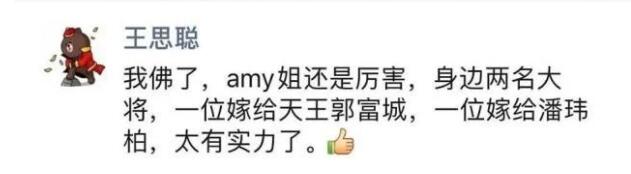 萬達集團董事長王健林的獨子王思聰,在微信朋友圈發文:「我佛(服)了,Amy姐還是厲害, 身邊兩名大將,一位嫁給郭富城,一位嫁給潘瑋柏,太有實力了。」王思聰向來跟娛樂圈有緊密關係,黃曉明、林更新及吳亦凡等均是其好友,他的這條微博更令網民好奇,並迅即搜尋「Amy姐」是何方神聖,發現她跟Luna及郭富城太太方媛有關係。