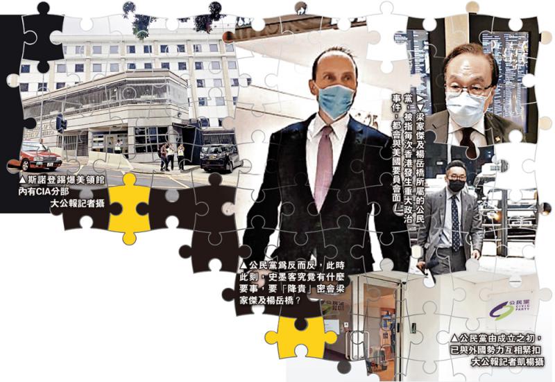 (大公報記者 高仁、段遠峰)公民黨四人日前被取消立法會參選資格(DQ),梁家傑、楊岳橋等公民黨核心成員前日被踢爆在中環密會美國駐港總領事史墨客(Hanscom Smith)。梁家傑聲稱是「恆常會面」。大公報發現,每逢香港出現重大政治事件,公民黨必與美方要員會面。梁家傑昨日接受大公報記者電話查詢時更直認,自從2001年他擔任香港大律師公會主席之時,就已和駐港使節有定期溝通,「唔知經過20年的恆常聚會要如何交代」。政界人士認為此次公民黨與史墨客的會面不尋常,亦有市民報警指公民黨勾結外國勢力,涉嫌違反香港國安法,要求該黨交代會面詳情。