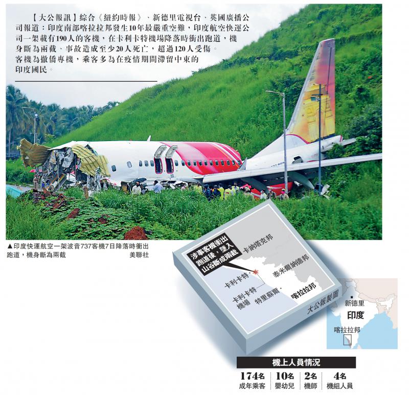 大公報綜合《紐約時報》、新德里電視台、英國廣播公司報道:印度南部喀拉拉邦發生10年最嚴重空難,印度航空快運公司一架載有190人的客機,在卡利卡特機場降落時衝出跑道,機身斷為兩截、事故造成至少20人死亡,超過120人受傷。客機為撤僑專機,乘客多為在疫情期間滯留中東的印度國民。